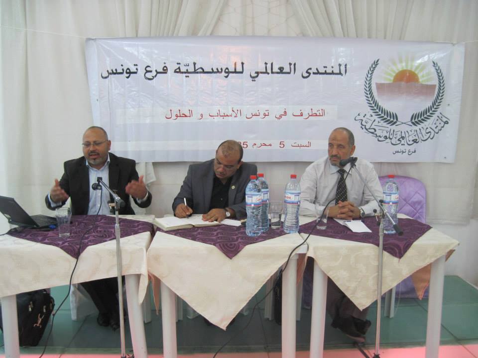 نظّم المنتدى العالمي للوسطية فرع تونس يوم الجمعة 8/11/2013 ندوة " التطرّف في تونس الاسباب والحلول" في منطقة الحرايْرية بحي الزّهور تونس العاصمة كان اختيار المكان بهذه الجهة الشّعبية، غرب العاصمة، التي يمكن أن يفرّخ فيها التطرف ويسيطر التيار ا المتشدد على الكثير من المساجد فيها بعيدا عن قدرة الدولة على الضبط وتعيين أئمة وسطييّن . حيث يسكن بهذه المنطقة شباب كثير من التيار المتشدّد يُسندهم في ذلك كهول لا يؤمنون بالدّولة اصلا في الوقت الذين يرون فيه تدهور آداء الدولة بعد الثورة .