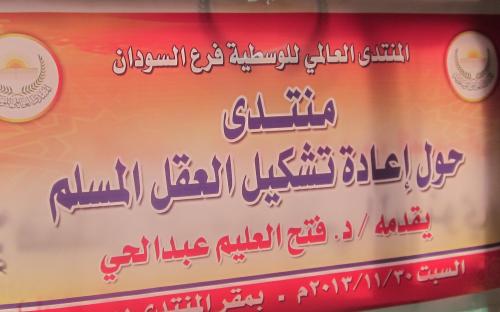 أقام المنتدى العالمي للوسطية بالسودان جلسة فكرية حوارية بعنوان " إعادة تشكيل العقل المسلم "يوم السبت 30/11/2013م . بمقر المنتدي بالخرطوم والذي قدمه الأستاذ فتح العليم عبد الحي عبد الله عضو المنتدي ومنسق منتدي يثرب الفكري والمفكر والباحث في الفلسفة والفكر المعاصر.