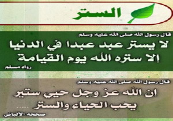 ـ عن عبد الله بن عباس رضي الله عنه عن النبي صلى الله عليه وسلم قال: (من ستر عورة أخيه المسلم ستر الله عورته يوم القيامة، ومن كشف عورة أخيه المسلم كشف الله عورته، حتى يفضحه بها في بيته) رواه ابن ماجه وصححه الألباني. قال المنذري: "ستر المسلم هو تغطية عيوبه وإخفاء هنَّاته (زلاته وهفواته وقبائحه)".