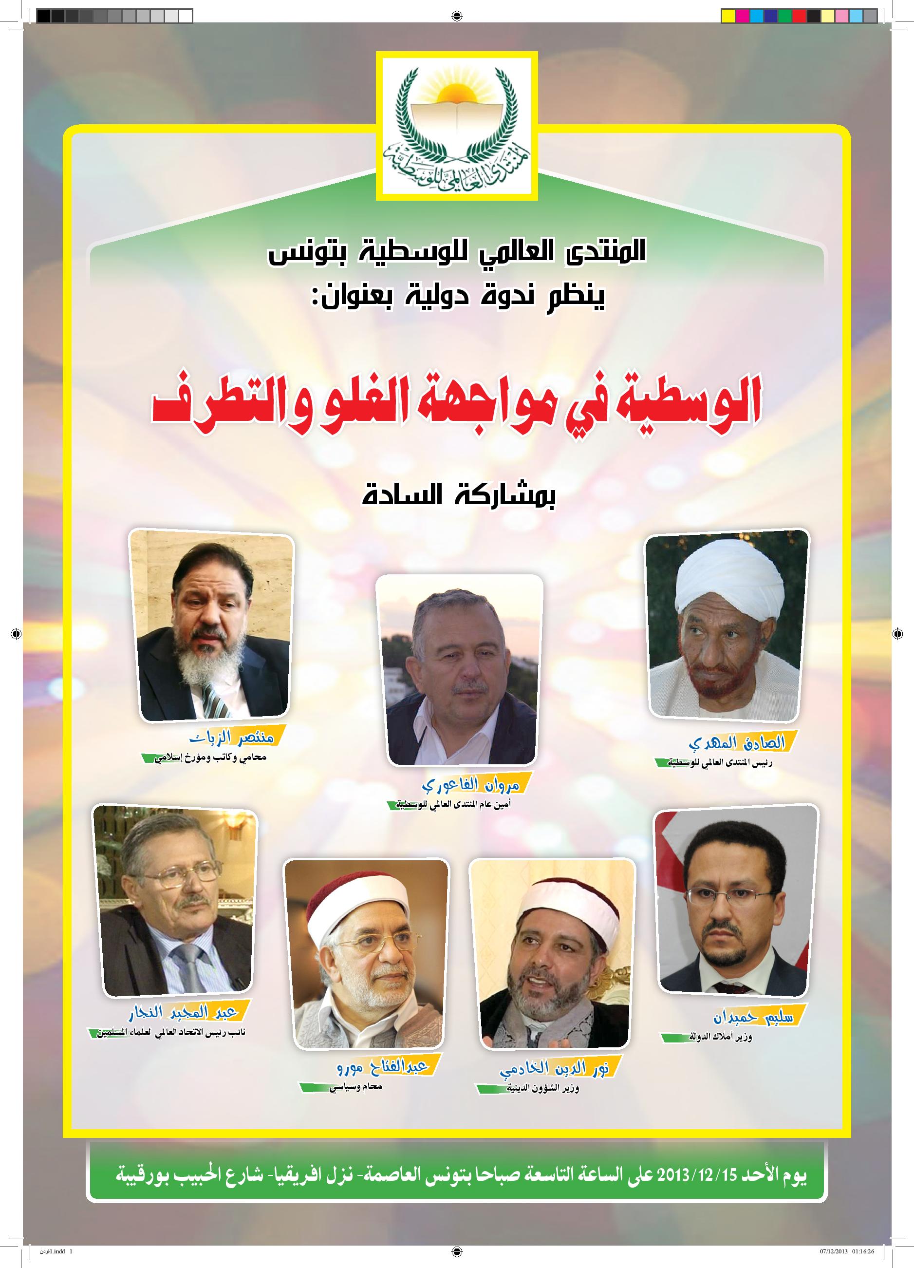 يقيم المنتدى العالمي للوسطية ندوة دولية بعنوان (الوسطية في مواجهة الغلو والتطرف) وذلك يوم الاحد 15/12/2013في تونس العاصمة ،يشارك فيها كل من :